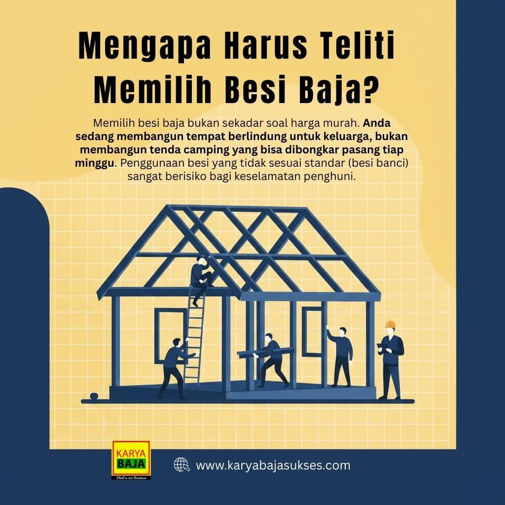 Memilih besi baja bukan sekadar soal harga murah. Anda sedang membangun tempat berlindung untuk keluarga, bukan membangun tenda camping yang bisa dibongkar pasang tiap minggu. Penggunaan besi yang tidak sesuai standar (besi banci) sangat berisiko bagi keselamatan penghuni.
